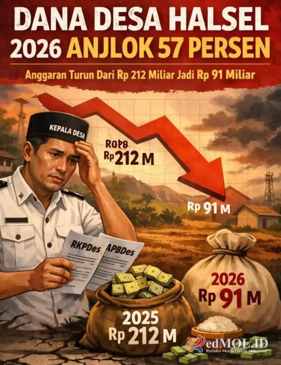 Pada 2025, pagu Dana Desa Halsel tercatat sebesar Rp 212 miliar. Sementara pada 2026, alokasi Dana Desa hanya sekitar Rp 91 miliar. Penurunan tersebut berdampak langsung terhadap perencanaan program desa serta jenis belanja yang dapat direalisasikan.