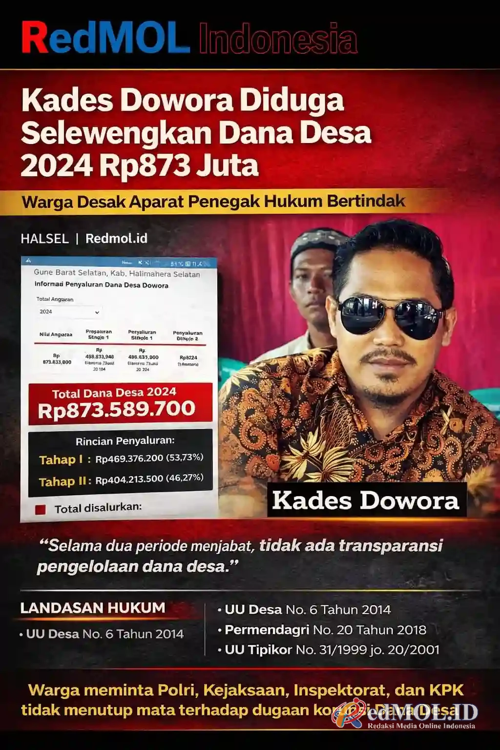 Halsel, RedMOL.Indonesia Warga Desa Dowora, Kecamatan Gane Barat Selatan, Kabupaten Halmahera Selatan, kembali menyuarakan kekecewaan dan kegelisahan mereka atas dugaan penyimpangan Dana Desa (DD) tahun anggaran 2024 oleh Kepala Desa, Eli Saleh. Diduga kuat, penyimpangan tersebut mencapai nilai fantastis sebesar Rp873.589.700, menimbulkan potensi kerugian negara. Rabu/11/2/2026