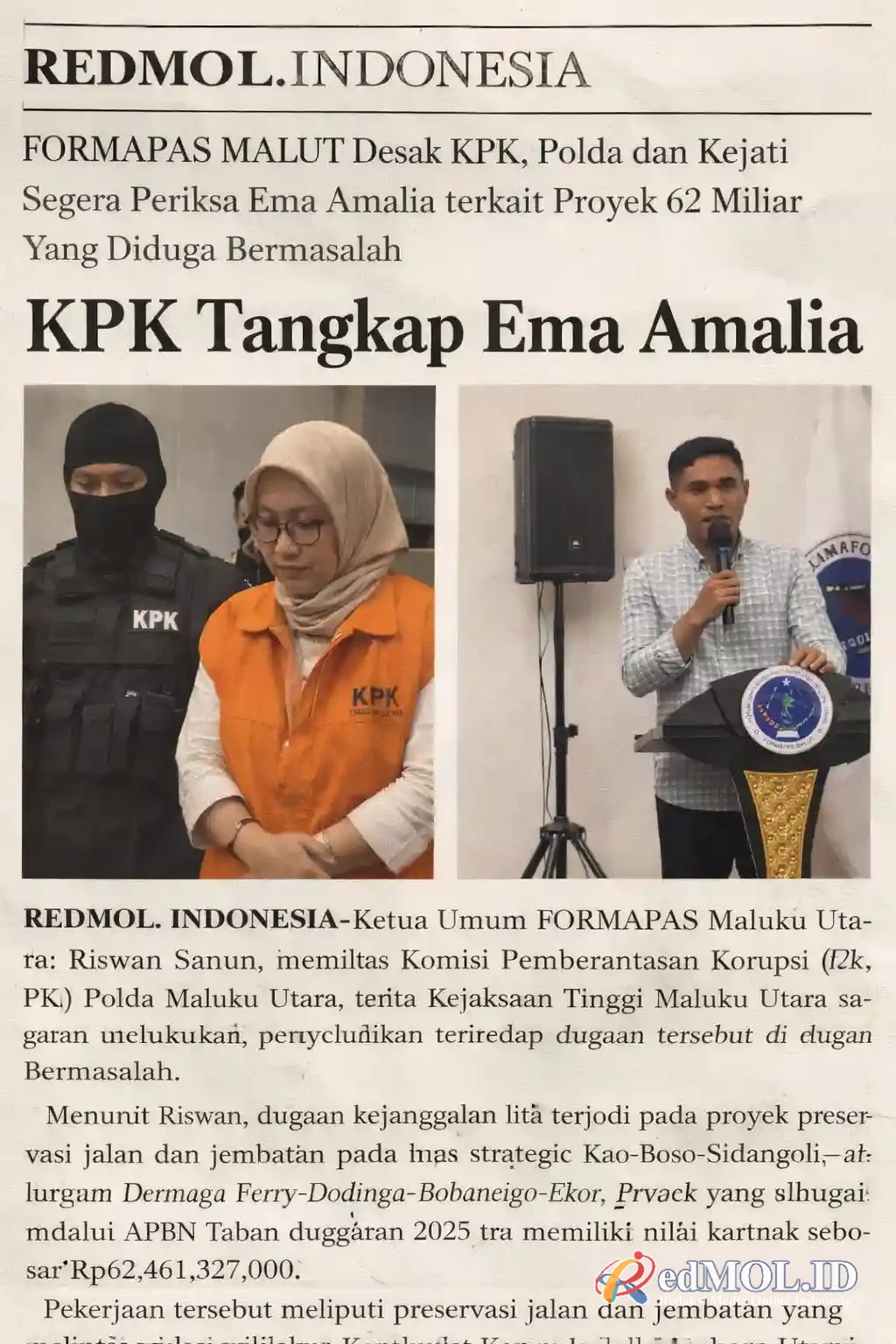 Ketua Umum FORMAPAS Maluku Utara, Riswan Sanun, meminta Komisi Pemberantasan Korupsi (KPK), Polda Maluku Utara, serta Kejaksaan Tinggi Maluku Utara segera melakukan penyelidikan terhadap dugaan tersebut.