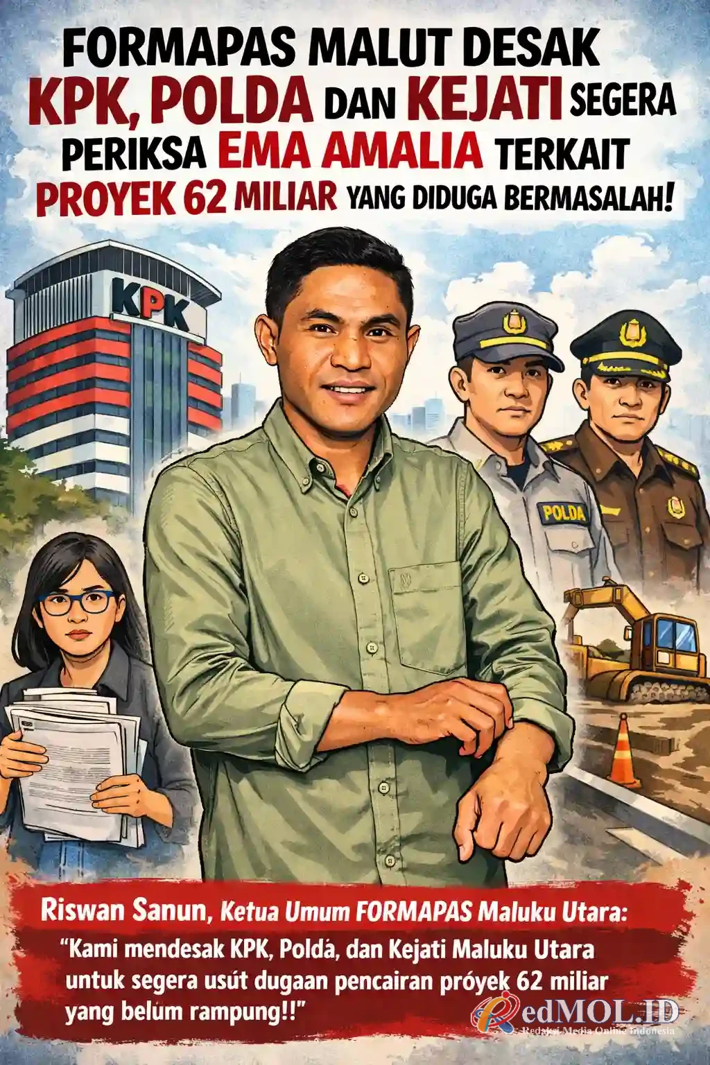 Karena itu, FORMAPAS Maluku Utara mendesak aparat penegak hukum untuk segera memanggil dan memeriksa Ema Amalia serta pihak-pihak lain yang diduga terlibat dalam proses administrasi maupun pengawasan proyek tersebut.